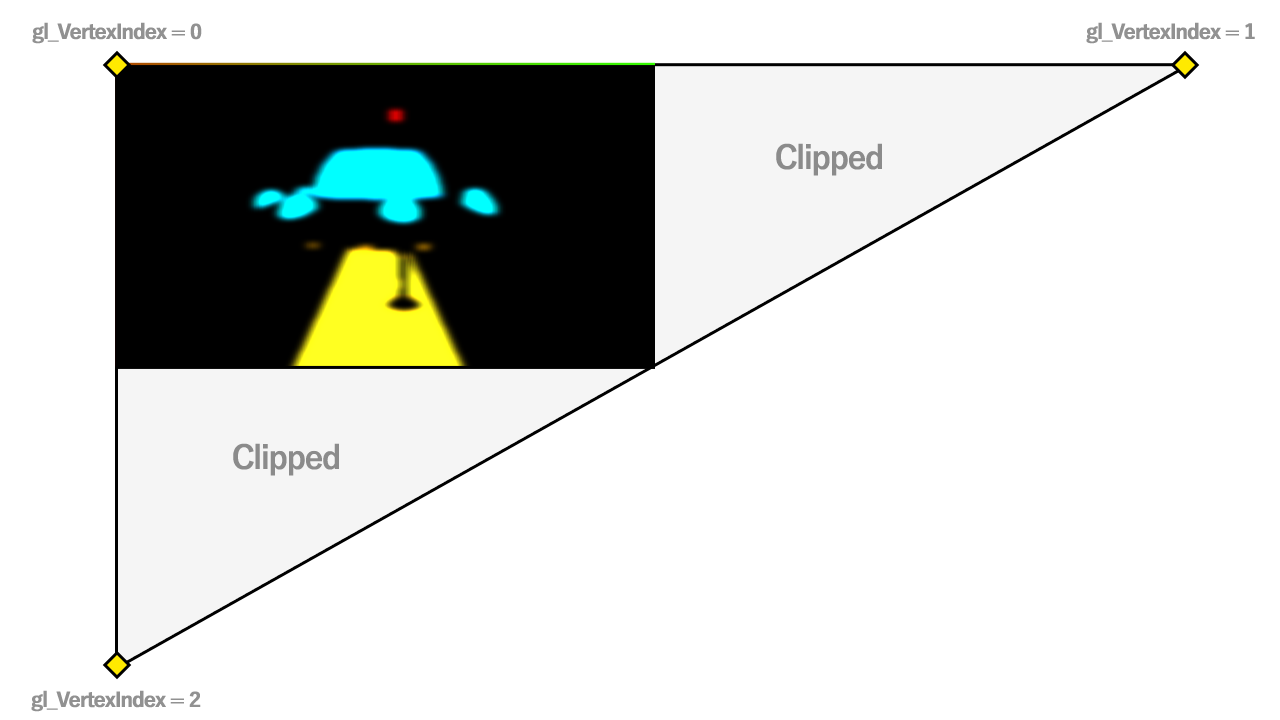 该三角形包含我们的整个屏幕以及 [0..1] 的整个 uv 范围,以便我们可以像普通的全屏四边形一样使用它来应用后期处理效果。由于 GPU 剪切了屏幕边界之外的所有内容,我们实际上得到了一个只需要 3 个顶点的四边形。而且由于裁剪是免费的,因此我们不会浪费带宽,因为三角形的裁剪部分(灰色部分)不会被采样。