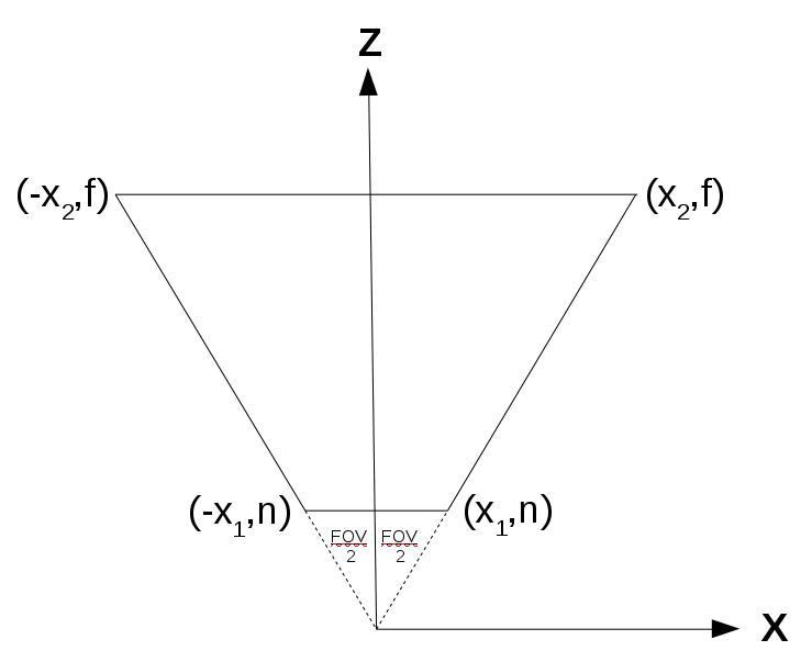 上图表示任意级联(因为每个级联本身基本上是一个截锥体,并且与其他级联共享相同的视场角)。请注意,我们是从上往下看 XZ 平面。我们需要计算 X 1和 X 2: