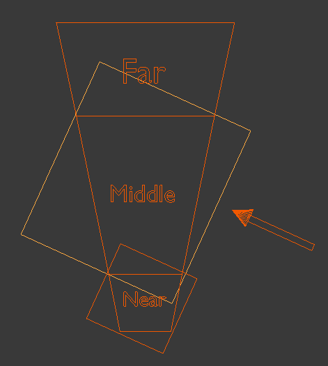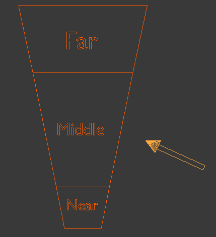 下一步是将近平面到远平面的范围分成三部分。我们将其称为近、中、远。另外,我们添加光线方向(右侧的箭头):